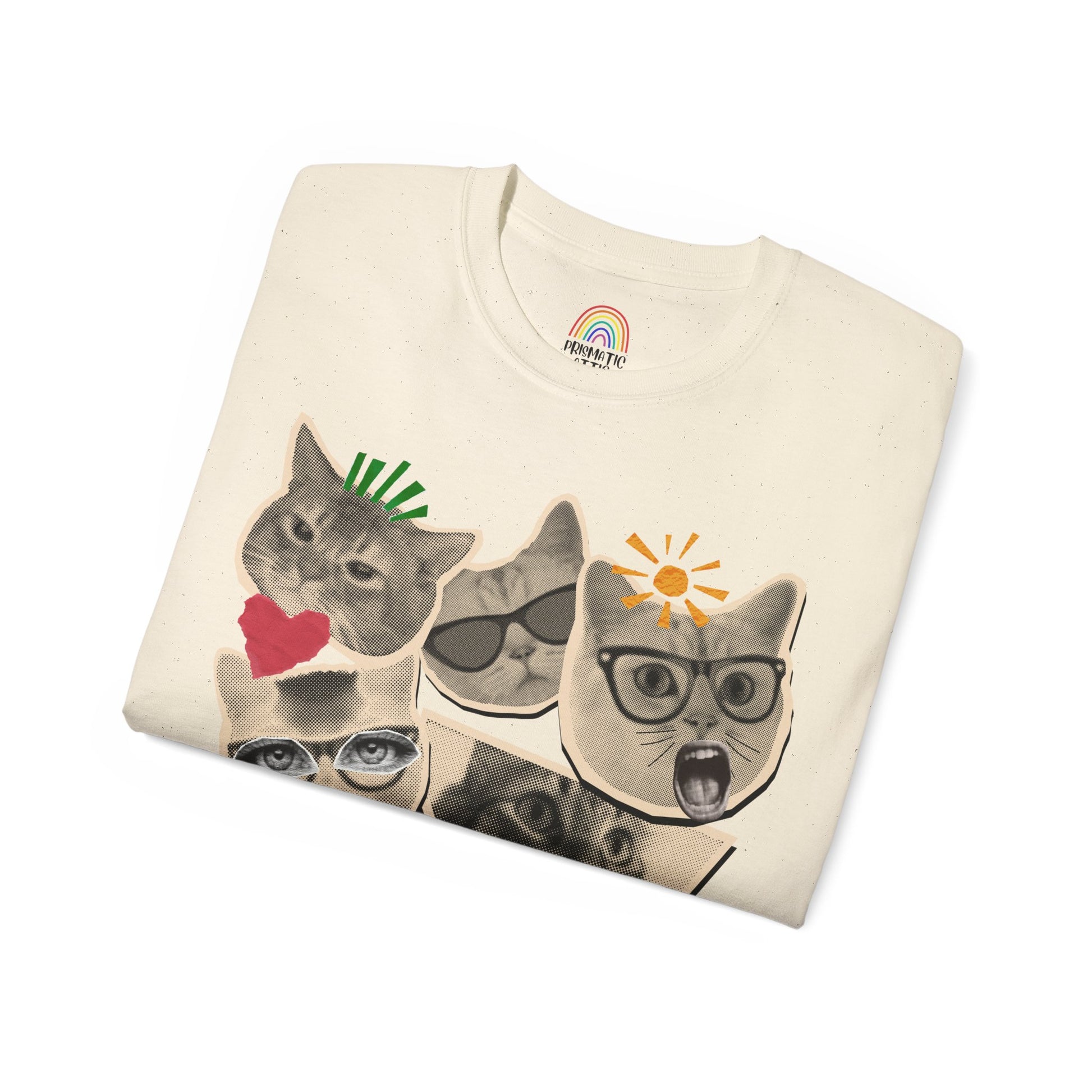 This zine-inspired design is made from torn magazine textures and quirky feline faces, brought together in a playful, cut-and-paste composition.